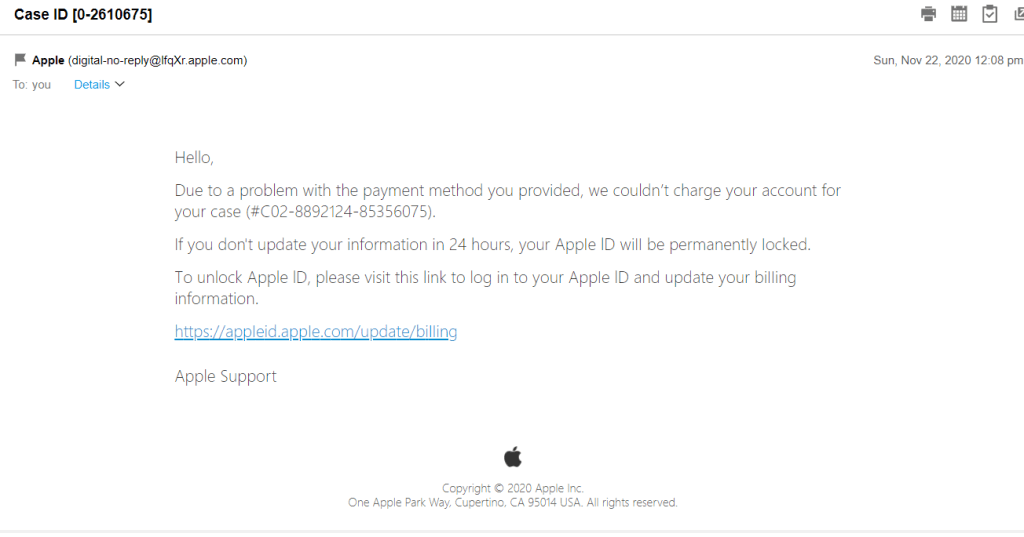 Here are two recent ones. One supposedly from Discover Card (note the sender’s address in both the Discover and beneath it the Apple. Both emails senders do not use official email accounts from the companies, so they make up ones that sound similar. Also pay attention how they don’t address you by name and just by either email address or the generic hello. They both try to get you to click on links to either put a virus on your computer or get you to input your login and passwords for your respective accounts (if you have either an apple or discover account). Be cybersafe everyone…