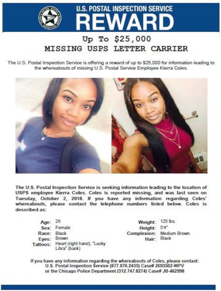 Kierra Coles was several months pregnant and believed she was going to have a son. However, the Chicago Postal Worker was last seen on surveillance video on October 2, 2018 in her work uniform leaving her apartment at 81st Street and Vernon Avenue. Her vehicle was found in front of her apartment along with cell phone, purse and a prepared lunch. It is believed that the father of her unborn child was one of the last persons to see her alive and that a mother of one of his children has personal issues with Coles. No suspect has been named but Chicago Police have looked at different people. There are several rewards for information as to where Coles is. Foul Play is strongly suspected.