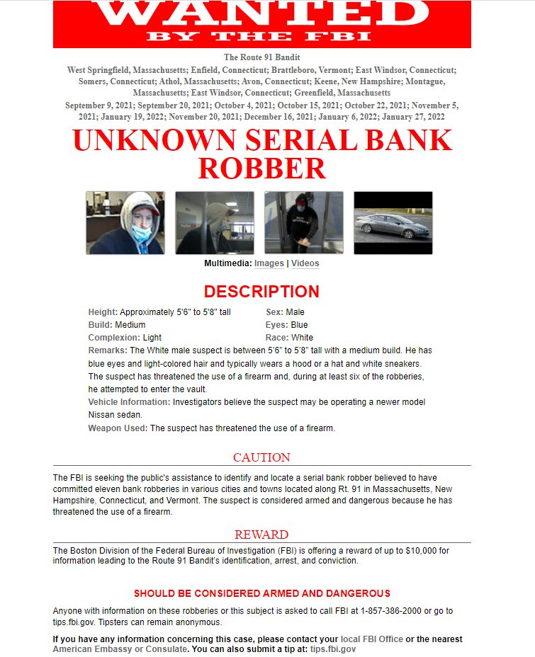 Most of these towns are close to Interstate 91. However Avon, CT seems to be a little further than the other robberies Post University (which Robber is wearing is a College out of Waterbury, CT.