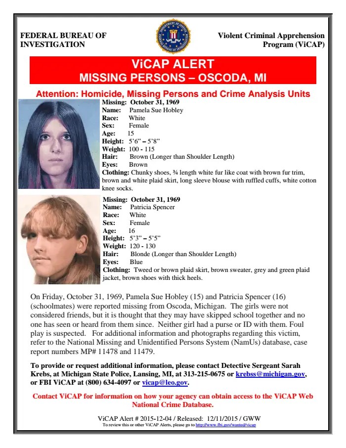 It was the day of Halloween in 1969, in the town of Oscada, Michigan (USA), when two teenaged girls were last seen alive. Patricia Spencer and Pamela Hobley both left their high school early after a bomb threat spooked the students and teachers at the school that day. Family members and Police believe both girls were murdered. No suspects have been named and a former boyfriend of one of the girls is alleged to have disappeared himself a year or so after the two went missing. It is not know if that is related to the case.
